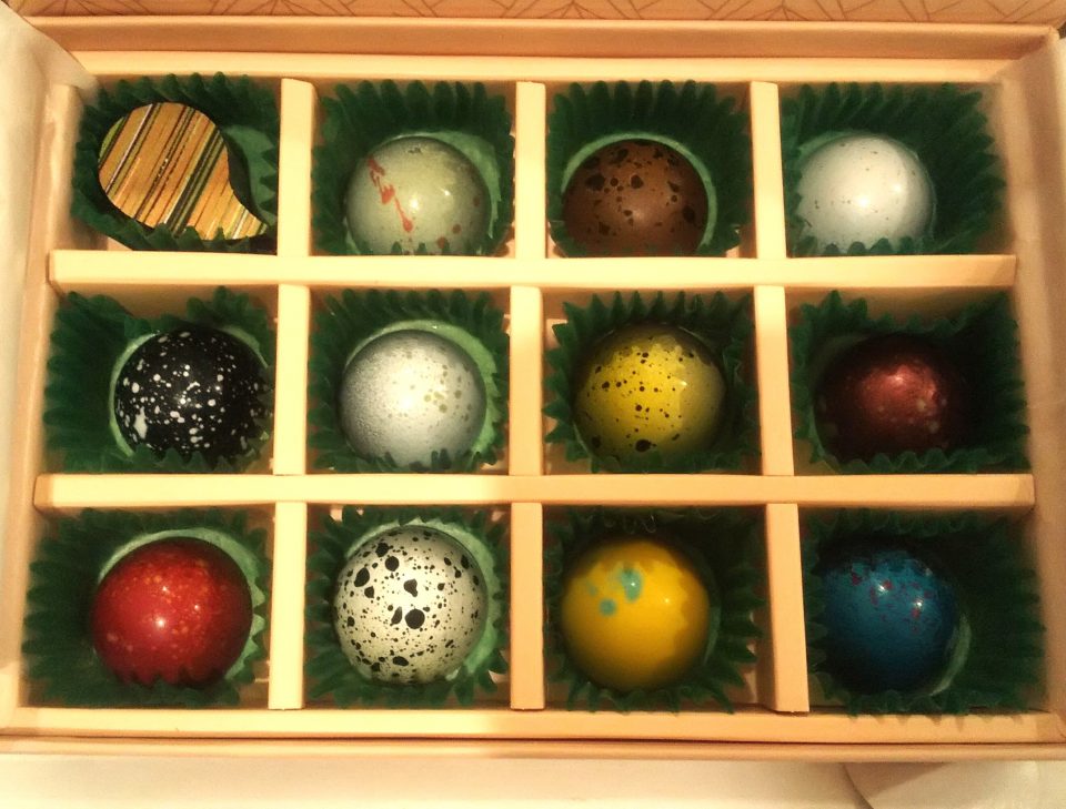 この、宇宙の惑星のようなチョコレートの一つ一つが、一口食べると驚きの発見でワクワクするんです。